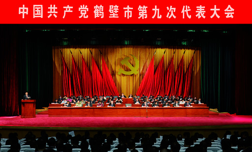 市人民会堂气氛庄严、热烈,主席台上方悬挂着“中国共产党鹤壁市第九次代表大会”会标,后幕正中是金色的党徽,十面鲜艳的红旗分列两侧。